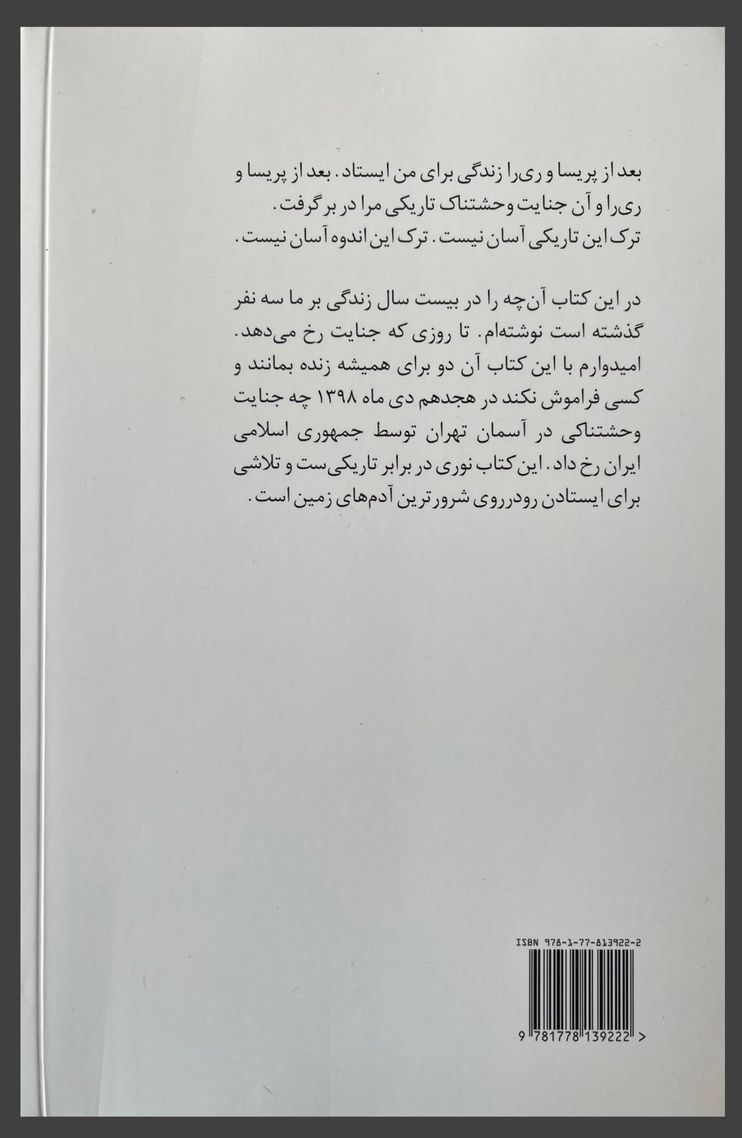 در این کتاب آنچه را در بیست سال زندگی بر ما سه نفر گذشته است نوشتهام. تا روزی که جنایت رخ میدهد. امیدوارم با این کتاب آن دو برای همیشه زنده بمانند و کسی فراموش نکند در هجدهم دی ماه ۱۳۹۸ چه جنایت وحشتناکی در آسمان تهران توسط جمهوری اسلامی ایران رخ داد. این کتاب نوری در برابر تاریکیست و راهی برای ایستادن رودرروی شرورترین آدمهای زمین است.